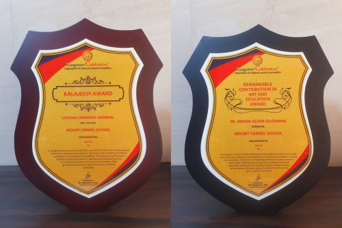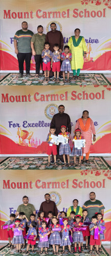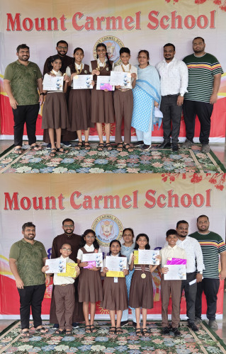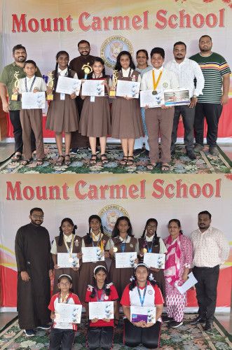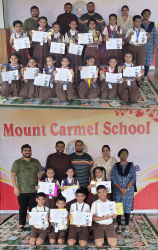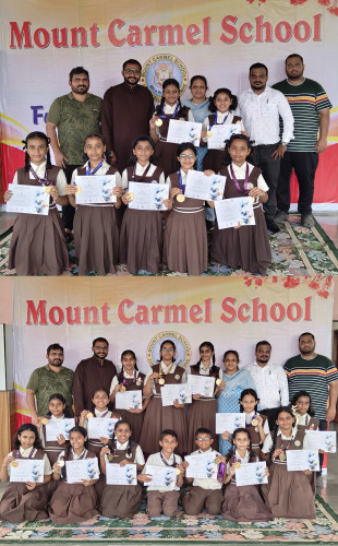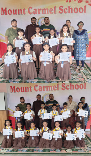 RANGOTSAV COMPETITIORangotsav Celebration: Mt. Carmel School Excels in National Art Competition Mt. Carmel School showcased exceptional artistic talent at the Rangotsav celebration, a national-level art competition. With an impressive 936 participants from the school, our students demonstrated their creative prowess across various categories. Notable Achievements: Aliza Dsouza (STD IV A) secured 1st prize in the Colouring Competition, winning an Avon 20T BMX cycle trophy. Aashvi Chalgeri (STD VI C) won 3rd prize in Greeting Card Making, receiving dual-tip colours art markers and a trophy. Harshit Poojary (STD VIII B) won 6th prize, earning a Velocity mini helicopter and silver medal. Overall Performance: 8 students won trophies 55 students received gold medals and gifts 35 students earned silver medals and gifts 20 students secured bronze medals and gifts 16 students received consolation prizes Competitions: The students participated in various categories, including: 1. Colouring Competition 2. Greeting Card Making 3. Finger and Thumb Painting 4. Cartoon Making 5. Sketching 6. Collage Making Special Recognition: 1. Fr. Pawan Saldanha, Principal of Mt. Carmel School, received the Remarkable Contribution in Art and Education Award acknowledging his commitment to nurturing creativity among students. 2. Mr. Loydan Ghonsal, Art Teacher, was honoured with the Kalageevi Award or his dedication and efforts in inspiring young artists. A Proud Moment for Mt. Carmel School. We extend our heartfelt congratulations to our talented students and commend the tireless efforts of our teachers and staff. Their dedication has made this achievement possible bringing pride to Mt. Carmel School and reinforcing our mission to inspire creativity and excellence. Congratulations to all participants and winners