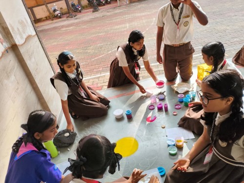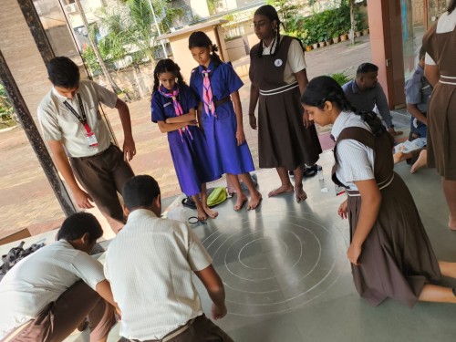 On Wednesday, 1st October 2025, a Rangoli Making Competition was organized for students of Standards 8 to 10. The event was a contest among the four houses, with the theme centered on Mandala Art. The competition aimed to encourage creativity and foster cultural exchange among the students. It commenced in the morning on the stage of Mount Carmel School. The participants, representing their respective houses, displayed great enthusiasm. The Rangoli designs they produced were vibrant and intricate, incorporating a variety of patterns and colors. The houses competed with commendable spirit and dedication. At the conclusion of the event, the results were announced: the Red House secured first place, followed by the Green House in second, the Yellow House in third, and the Blue House in fourth. The competition not only brought immense joy and excitement but also created a festive and inspiring atmosphere for all the students involved.