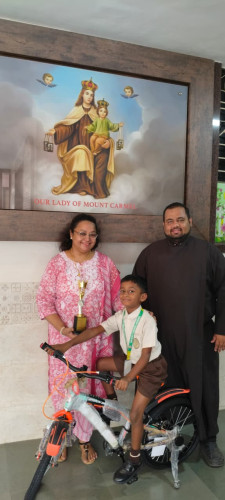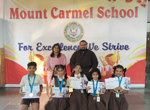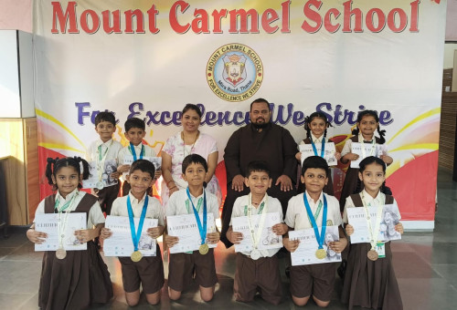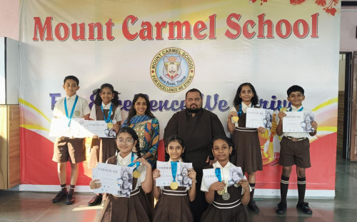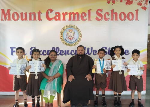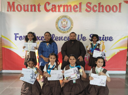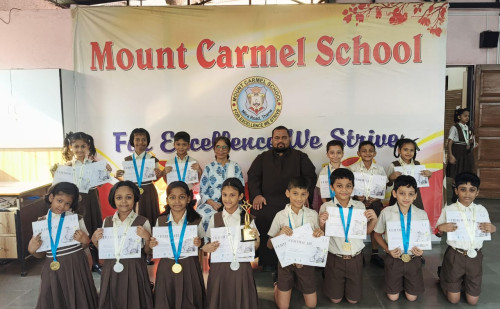The Rangotsav Award Distribution Ceremony was held at Mount Carmel School with great excitement and pride. The event celebrated the creative talents of students who participated in various Rangotsav competitions . Mount Carmel School achieved outstanding success at the national level in various categories, including Colouring, Handwriting, Collage Making, and Finger and Thumb Painting. The ceremony was graced by the Primary Principal, Father Nelson, who distributed the prizes to the winners. His presence encouraged and motivated the students to continue exploring their artistic abilities. During the event, the school’s Supervisor Tr. Brinal Crasto received the Art Teacher Award, an honour that recognized her dedication and guidance in nurturing creativity among the students. Students eagerly awaited the prize announcements. The 1st Prize winner Vian Gopan from Grade one, received a small bicycle with trophy. The winner Adele Rodrigues from grade two won fourth prize and received medal with colouring kit and winner Sujan Poojari from grade four won Excellent effort award and received piggy bank along with Bronze medal. This brought immense joy and applause from everyone present. Among all the participants, 4 students received Art Merit award and trophy, 72 students won gold medals, 34 secured silver medals, and 27 received bronze medals, appreciating their consistent efforts and creativity. In addition, consolation prizes were given to encourage participants who showed promise and enthusiasm. Furthermore, many students were selected for the second round of competition. The ceremony concluded with smiles, cheers, and a sense of achievement among the students. The Rangotsav Award Distribution at Mount Carmel School proved to be an inspiring and memorable event, motivating students to continue participating in creative activities.